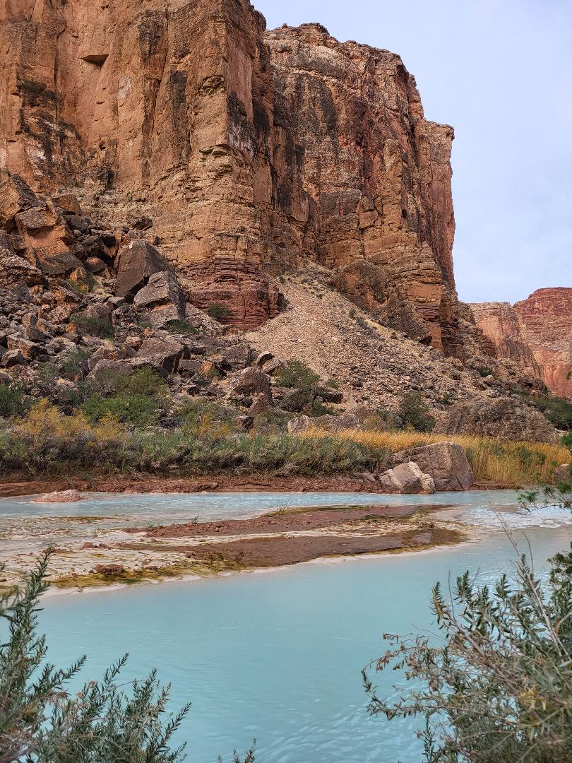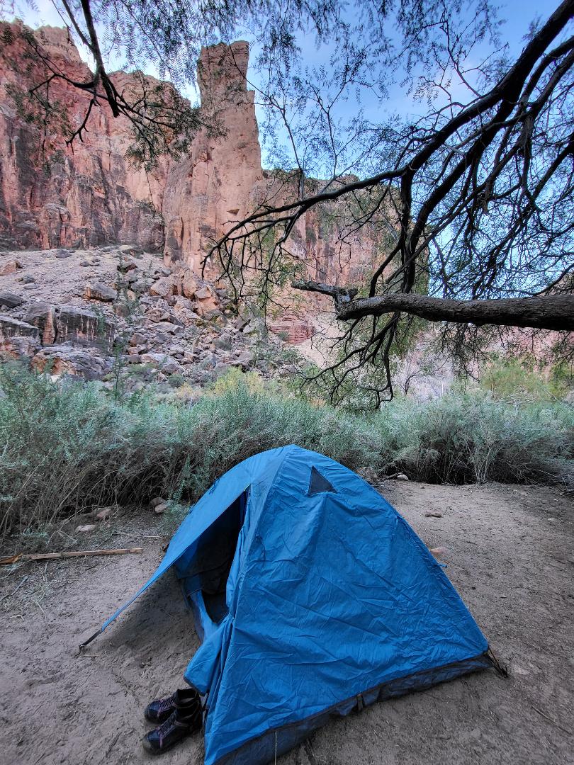 I was thrilled to have found a place to set my stuff. I quickly set up my tent, then grabbed a towel and found easier access to the riverbank, where I stripped down to my birthday suit and waded into the unbelievably blue water. I washed the blood and dust from my body and scrubbed my sweat soaked clothes in the river. I had worn the stupid neoprene pants to keep warm since it was in the 20s that morning, but in the afternoon sun I had sweat so much that when I sat down to rest, the rocks had been wet and literally made me question whether I had peed myself. As I bathed, my feet stuck in the goopy mineral deposits along the bank, and I almost lost my Jambus trying clumsily to get out. I snapped a few pictures of the mythical looking river that I had just about killed myself to see, and headed back up the trail towards my tent. All I wanted now was some food and to lie down.