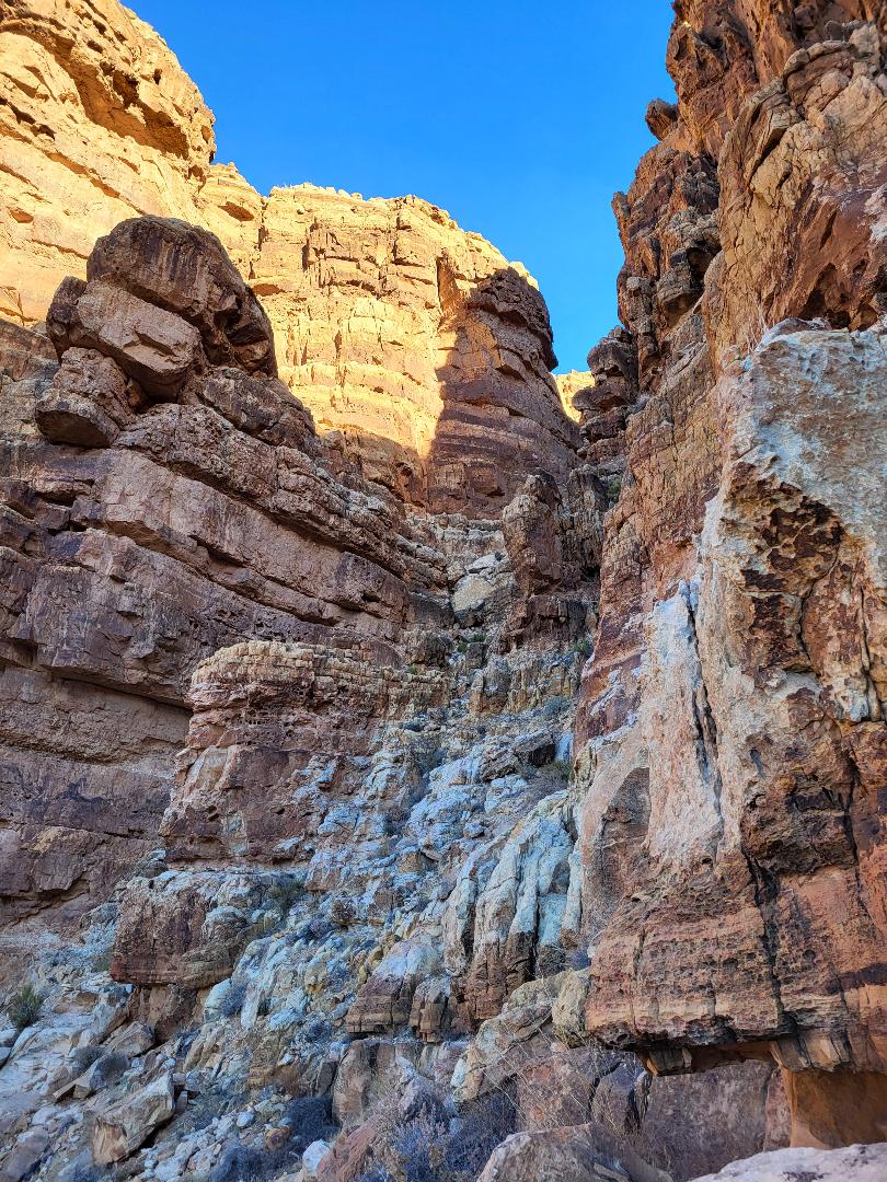 Initially when I planned this trip, I wanted to hike the extra twelve miles roundtrip to the Confluence with the Colorado River on day two, then hike out on day three. Logic now told me that was a dumb idea, and I should consider hiking out tomorrow. Even if I only made it halfway, the wash where I had crossed sides in the canyon had some places for a tent, and taking two days to hike out would break up the torture. As eager as I was to have come here and as magical of a place as it was, I saw what I came to see and I just wanted to wiggle my nose and be done with it. Unfortunately I still had a brutal return trip to make with muscles that would no doubt seize up overnight and toes that were so bruised and battered no amount of taping them was going to help.
