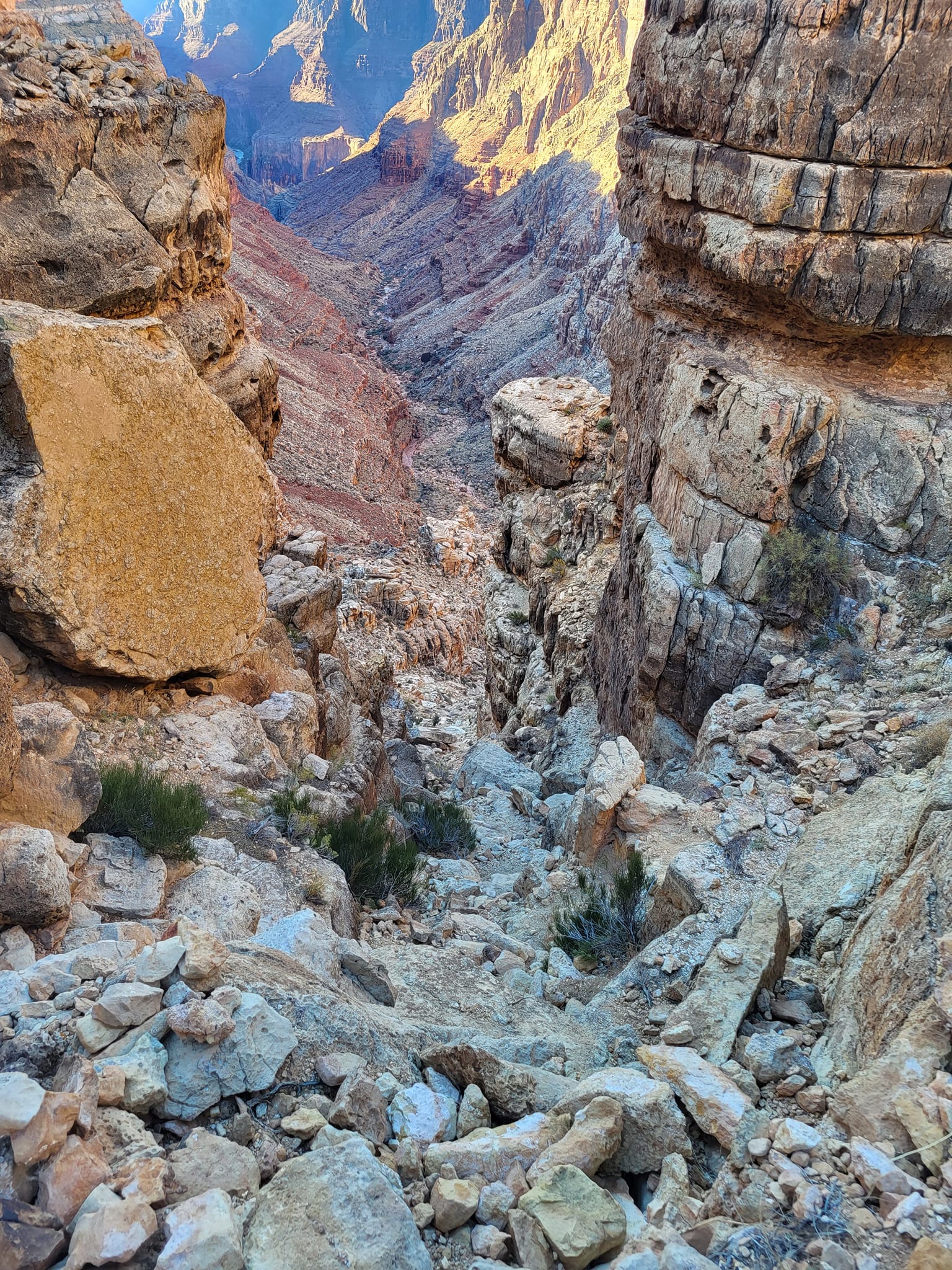 When I reached the seven foot rock face, I found foot holds and somehow managed to scale it, but the loose rock and incredibly steep climb was treacherous. I could see the top of the canyon wall and it was so close, but I couldn’t find a passable path upwards or any cairns marking the way, just a gap between two fallen rocks. There were footprints in front of the boulders so assuming I had found the trail, I ducked down, turned sideways and tried to slide through the tight space with my pack and tent wedging up against the sides. When I popped out on the other side, I was on top of a cliff, looking several hundred feet straight down. I couldn’t back up or turn around because of the gear on my back. I tried desperately to maneuver myself around but almost fell trying. At times like this, I’d love to turn off my internal dialog because that very unhelpful voice in my head spoke loudly to me “This is it! This is how it ends”. While in reality, it was probably only a minute or two, it felt like ages that I stood, completely stuck on that cliffside, unable to move and certain death if I fell. Eventually I managed to sit down on the edge and use my hands and feet to slowly walk myself backward and upward, then managed to roll onto my stomach and crawl haphazardly back through the gap between the two rocks, shifting constantly to keep my pack and tent from getting stuck. I sat for a moment in shock at how closely I had just come to dying.